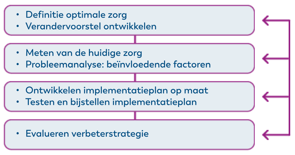 Om te zorgen voor de juiste toepassing van het verbeterinitiatief en om te toetsen of deze toepassing op de juiste wijze wordt gedaan, wordt bij het implementeren van grotere verbeterinitiatieven een stapsgewijs implementatieproces gevolgd: het implementatieproces naar Grol&Wensing.