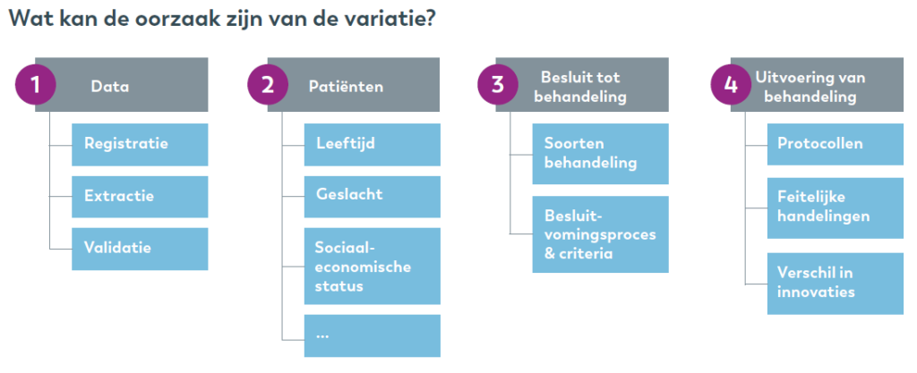 Wat kan de oorzaak van variatie in uitkomstdata zijn? Voor ieder geobserveerd verschil worden vier stappen doorlopen om deze verschillen zo gestructureerd en zorgvuldig mogelijk te duiden.